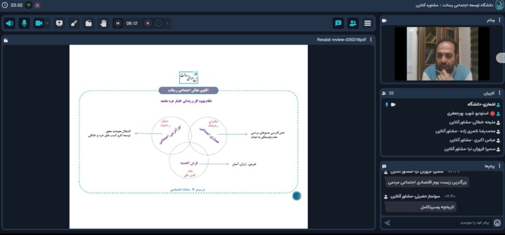 یکی از خدمات سوپر اپ «امرسالت» که در دسترس اعضا قرار گرفته، سامانه «مشاوره آنلاین» میباشد. برای بهبود پاسخهای مشاوران در این سامانه، دانشگاه توسعه اجتماعی رسالت، دورهای را پیادهسازی نموده است. در این دوره، شرکت کنندگان با ابعاد الگوی تعالی اجتماعی رسالت، فرایندهای سامانهها و نحوه پاسخگویی در آن مهارت افزایی میشوند.